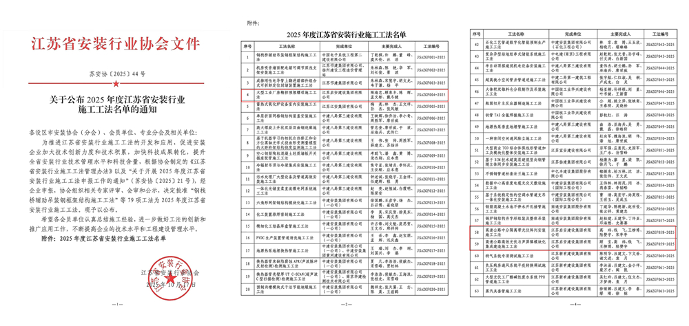 10月17日,江苏省安装协会发布《关于公布2025年江苏省安装行业施工工法的通知》 ,集团公司申报的3项施工工法顺利获评。此次获评的工法分别是亨立分公司常熟华域项目申报的《大型工业厂房精控预埋螺母施工工法》,金润分公司吴江高速公路项目申报的《高速公路中分隔离带光伏阵列安装施工工法》《高速公路高效光伏与声屏障模块化集成建造施工工法》。这批工法的获评得益于集团公司的高度重视、精心策划及苏州区域的科学组织、认真落实,更得益于各小组团队依托项目特点,潜心挖掘技术亮点、梳理施工工艺、组织工法编制,在提升工程科技含量的同时展示了公司基层的科技实力。(工程部、苏州公司)